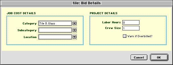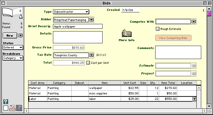 Job Cost Details Project Details When you first create a bid, its status is Entered. If you would like to identify bid requests that have been sent out, you can change the status to Requested. You can also use the Received status to mark bids that have been received from bidders. When an estimate is accepted, the Goldenseal software automatically changes the status of each non-competitive bid to Awarded. When an estimate is awarded, the status of each competitive low bid will also change to Awarded. Losing competitive bids are given High Bid status. HINT-- If for some reason you don't want to accept the lowest bid, change its status to Void before accepting the estimate. If you decide not to use a bid, change its status to Void. Bids can show a detailed list of items that are included in the bidding record. To use a breakdown, choose Category or Item from the Breakdown menu at lower left. Use a Category breakdown to type in a list of items. HINT-- Use a bid breakdown if you want to use unit costs to calculate an approximate amount,