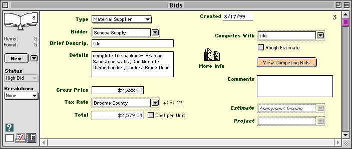 Enter the following information for each Bid: Type-- Use the pop-up menu to select the type of vendor providing the bid. Date-- Enter the date of the bid. Estimate-- When you include this bid in an Estimate, Goldenseal fills in the estimate name. Click the More Info button to enter the following details for each Bid record: