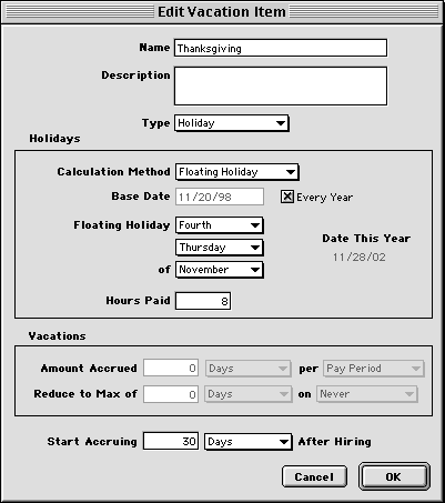 If you enter Holiday in the Vacation Item Type field above, these fields become active: