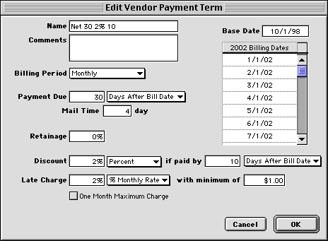 Payment Due-- Enter the date when payments are due. Use the pop-up menu to determine how the due date is figured. If you select "days after bill
