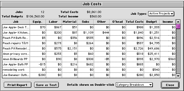 The Job Costs report is a quick way to see overhead and project costs, so you can make cost control decisions about future work. It can even help you decide which of your employees are most productive. Double-click on a project to see a cost breakdown by category.